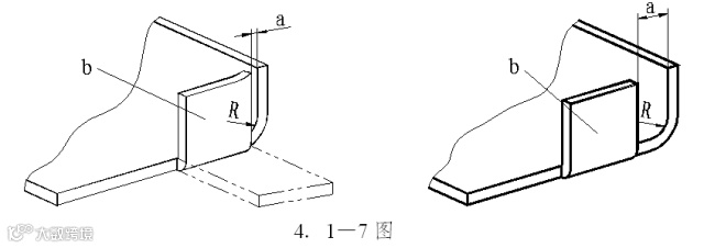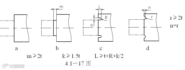 6 防止侧面(梯形)弯曲时产生裂纹或畸形。应设计预留切槽,或将根部改为阶梯形。槽宽K≥2t,槽深L≥t+R+K/2。