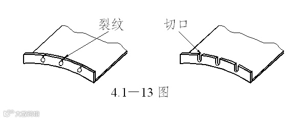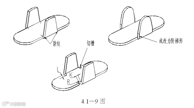 若象a图那样弯曲线和阶梯线一致,有时会在根部开裂变形。所以使弯曲线让开阶梯线如图b,或设计切口如c、d那样。