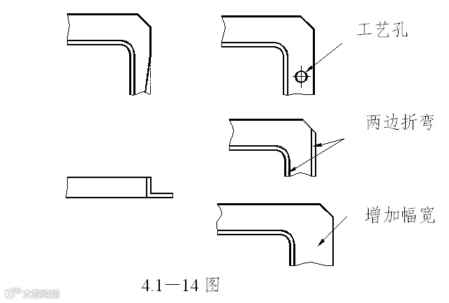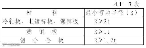 板件弯曲时,若弯曲处的圆角过小,则外表面容易产生裂纹。若弯曲圆角过大,因受到回弹的影响,弯曲件的精度不易保证。为此规定最小弯曲半径。见4.1-3表。