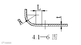 3 弯曲边冲孔时,孔边到弯曲半径R中心的距离L不得过小,以免弯曲成型后会使孔变形。其值L≥2t方可。见4.1—6图。