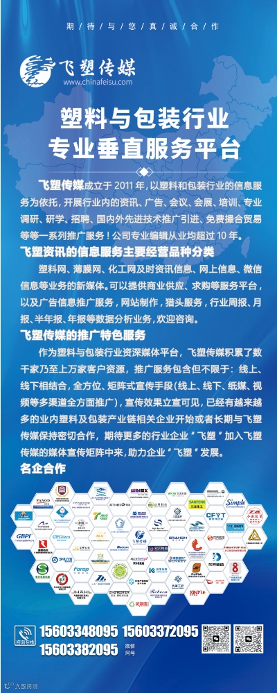 飞塑传媒的推广特色服务:作为塑料与包装行业资深媒体平台,飞塑传媒积累了数千家乃至上万家客户资源,推广服务包含但不限于:线上、线下相结合,全方位、矩阵式宣传手段(线上、线下、纸媒、视频等多渠道全方面推广),宣传效果立宣可见,已经有越来越多的业内塑料及包装产业链相关企业开始或者长期与飞塑传媒保持密切合作,期待更多的行业企业“飞塑”加入飞塑传媒的媒体宣传矩阵中来,助力企业“飞塑”发展。