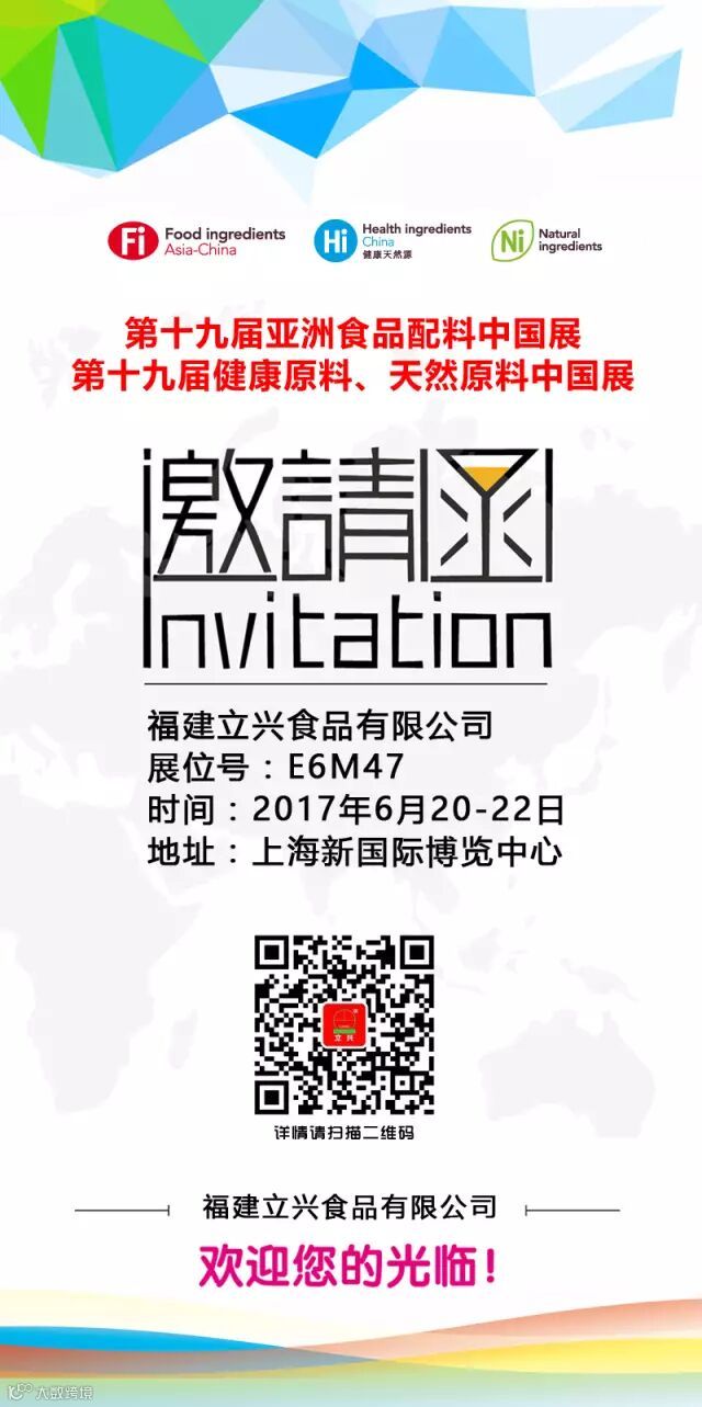 非常感谢您对我司福建立兴食品长期以来的大力支持,我公司将参加2017年第十九届亚洲食品配料中国展(上海),值此上海展会到来之际,我们在此真诚的期盼您的参观,恭候您的到来。