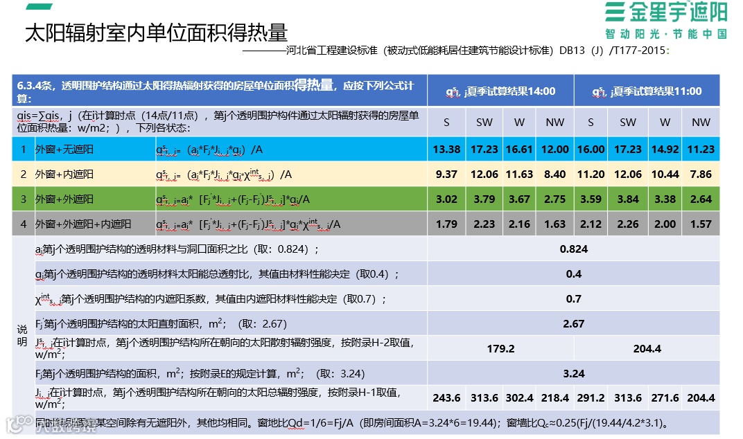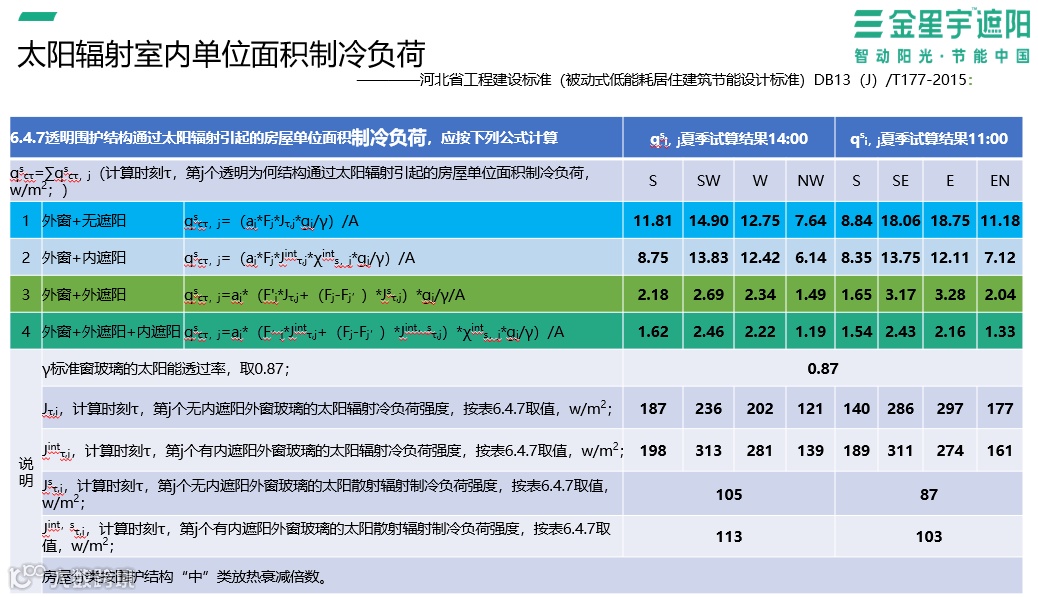 由上两表可见,由外窗+无遮阳到外窗+内遮阳,再到外窗+外遮阳,最后到外窗+外遮阳+内遮阳,室内单位面积的太阳辐射得热量和制冷负荷在逐步递减,在保证舒适度的前提下,大大节约了制冷负荷,也就节约了能耗;更为关键的是,如果是活动式遮阳,冬季收起,让外门窗充分得热,从而使得室内单位面积太阳辐射得热上升,也可以降低室内的供暖负荷,在保证舒适度前提下,有效降低冬季的供暖能耗。