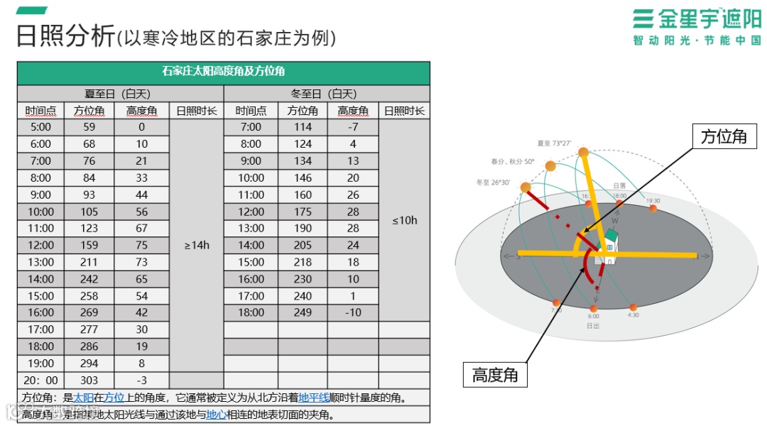 坦言,如之前的文章所述。建筑门窗发展至今,除太阳光引起的太阳得热重视程度不够外,其他8大指标确实做得非常好!其实,行业内还有种声音,就是:寒冷地区,建筑如果使用了高性能门窗,就不需要再单独设置遮阳;本来嘛,寒冷地区,尽管太阳辐射强度比较大(≥300w/m²),但太阳的高度角和方位角都不大,且日照时长也不长(以河北省石家庄市为例,如下表)。