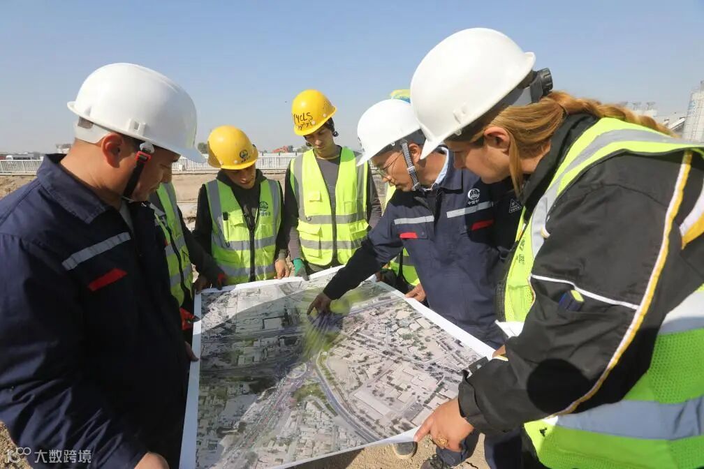 2024年3月2日,中伊员工在伊拉克巴格达尼苏尔立体交通枢纽项目现场讨论施工进展。新华社发(哈利勒·达伍德摄)