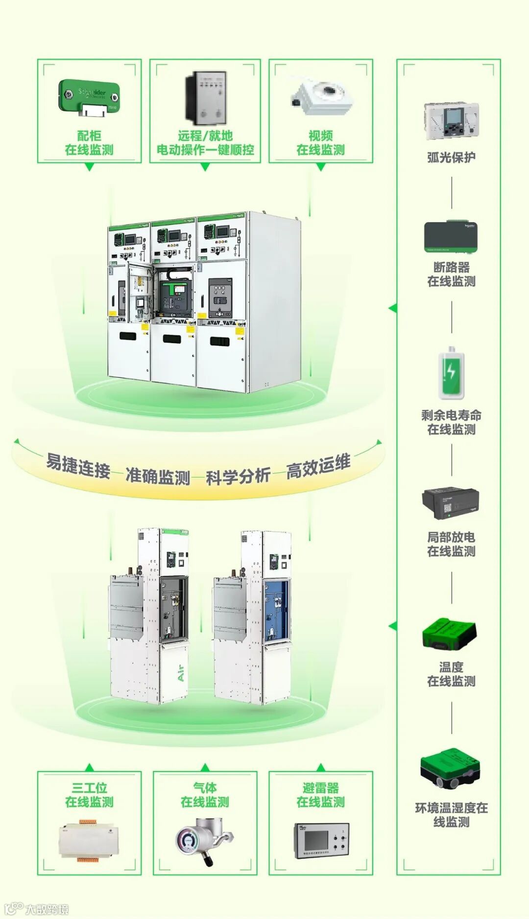 法腾电力拥有施耐德授权柜Prisma-E、BlokSeT、MVnex550、MVnex-12、MVnex-24、以及超紧凑VGK400、中低压KA矿用柜、模块化预制舱、移动车载变等全系列数字化预智成套设备,并拥有Digitalpower生命周期管理系统软件,独立法腾云。独创EPC+O&M数字化总承包新模式(设计、采购、施工、运营、保养)通过大数据云计算,实时为客户的安全用电保驾护航,让合作伙伴用电更省心,为客户企业发展腾飞插上数字化翅膀。