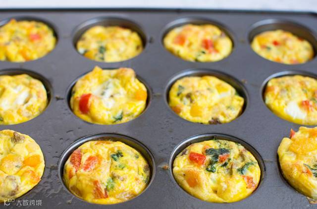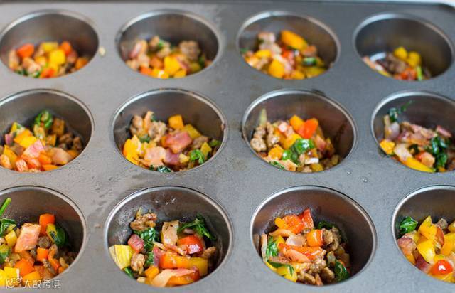 1. 预热烤箱至150°C,在烤盘上放置一些馅饼模,并在馅饼模上刷上一层植物油。在锅中加入植物油烧热,加入切碎的甜椒椒和洋葱,炒2至3分钟,再加入肉和菠菜,再加上食盐,炒熟。往每个馅饼模中加入一汤勺炒好的馅料。