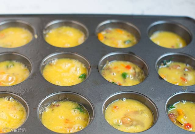 2. 鸡蛋打入一个碗中,加入适量的牛奶,切碎的蔬菜,甜椒,盐,胡椒粉,拌匀。把拌好的混合物倒入烤模中。