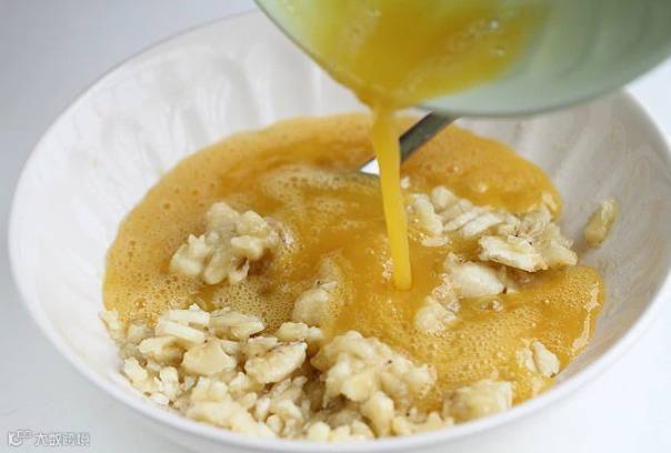 3. 把蛋液倒入香蕉泥中,拌匀。