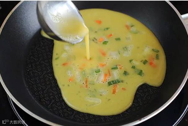 2. 将鸡蛋打入一个碗中,加入切碎的蔬菜,洋葱和香葱,再加上食盐,胡椒粉,牛奶,拌匀。平底锅烧热,在锅底均匀地刷一层植物油。将蛋液倒入平底锅并抹匀。