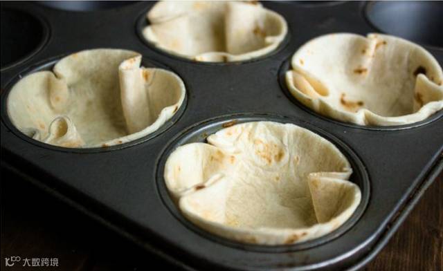 1. 烤箱预热到150度,烤盘内摆好圆形烤模,并在烤模上刷上一层植物油。玉米饼切成合适大小的圆形,放入烤模中。