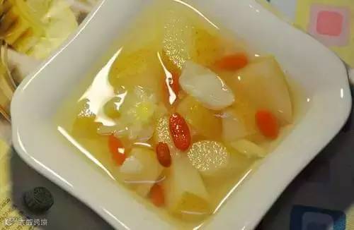 百合用清水浸泡一夜,次日将百合连同清水一起倒入砂锅内,再加半碗多清水,煮1个半小时,待百合已烂时,加去皮切作块的雪梨和冰糖,再煮30分钟即成。 滋阴润肺,宁心止嗽。肺虚久咳者食用,常人食用亦有益肺胃之功。