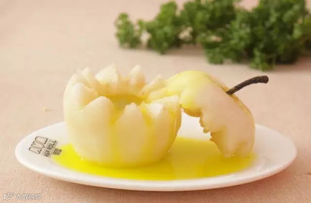 白梨挖去核心,将其他三味同放梨内,盖好扎紧放碗中,隔水炖熟。服食。