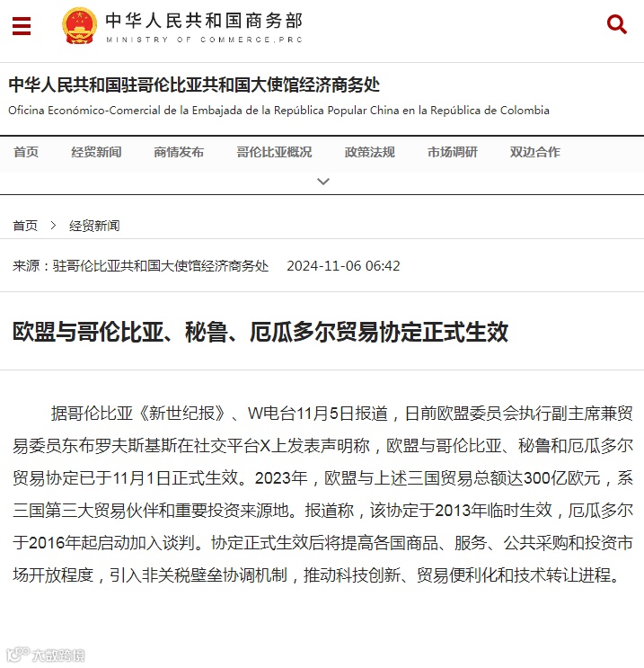 据哥伦比亚《新世纪报》、W电台11月5日报道,日前欧盟委员会执行副主席兼贸易委员东布罗夫斯基斯在社交平台X上发表声明称,欧盟与哥伦比亚、秘鲁和厄瓜多尔贸易协定已于11月1日正式生效。2023年,欧盟与上述三国贸易总额达300亿欧元,系三国第三大贸易伙伴和重要投资来源地。报道称,该协定于2013年临时生效,厄瓜多尔于2016年起启动加入谈判。协定正式生效后将提高各国商品、服务、公共采购和投资市场开放程度,引入非关税壁垒协调机制,推动科技创新、贸易便利化和技术转让进程。