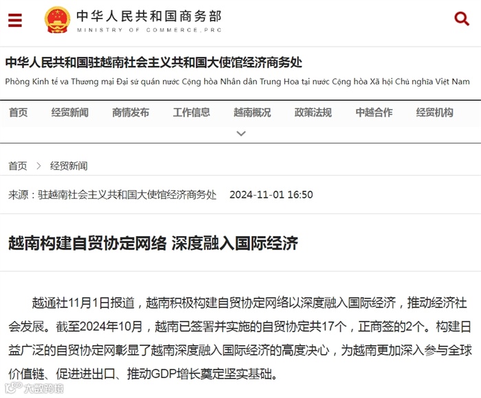 越通社11月1日报道,越南积极构建自贸协定网络以深度融入国际经济,推动经济社会发展。截至2024年10月,越南已签署并实施的自贸协定共17个,正商签的2个。构建日益广泛的自贸协定网彰显了越南深度融入国际经济的高度决心,为越南更加深入参与全球价值链、促进进出口、推动GDP增长奠定坚实基础。