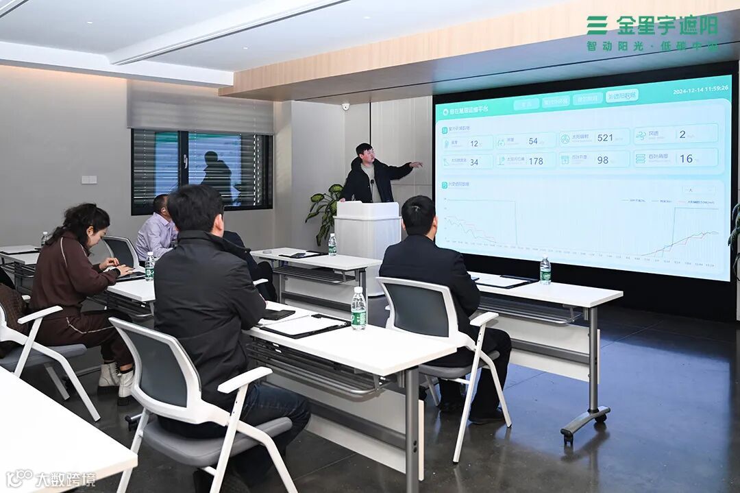 为直观展示建筑遮阳在节能降碳方面的实际成效,金星宇遮阳智能系统产品经理马昌伟以企业自主建设的超低能耗办公楼为样板,现场展示了运维平台上该大楼的各项运行能耗监测数据情况,介绍了智能外遮阳系统在应对复杂环境下的自动化调节功能。梁世格董事长进一步总结了该项目的节能实施路径和探索结论,用数据证明了智能遮阳在降低太阳得热能耗负荷、优化室内光环境等方面的显著贡献,是窗洞口最优选的节能产品。