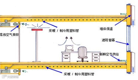 将高性能工程塑料管铺设在混凝土楼板内,冬天采暖进水水温33℃,回水30℃,夏天制冷进水18℃,回水温度21℃,通过冷热水的控温,夏天制冷,冬天采暖,室内温度恒定在20-26℃。
