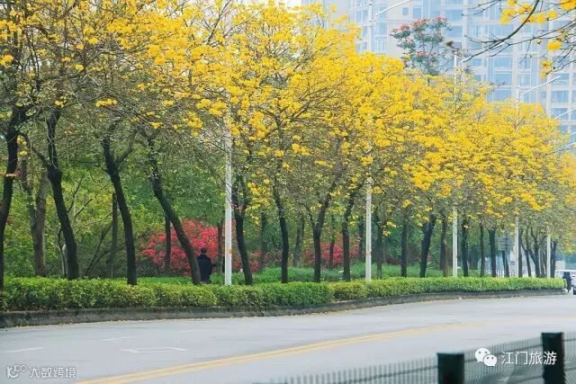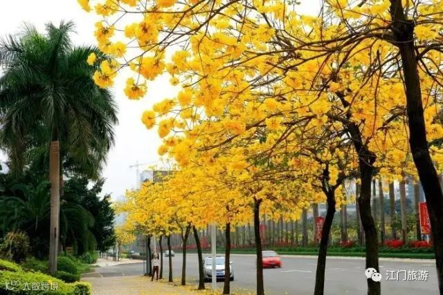 每年阳春三月,你可以约上三五好友,一起去到江门发展大道看黄花风铃木。只有看过江门街头的黄花风铃木,才知道风铃木开时有多美!