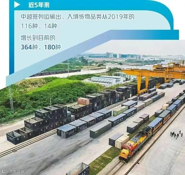 数据表明,高效、实惠、便捷的中越班列已得到市场认可。近5年来,中越班列运输出、入境货物品类从2019年的116种、14种,增长到目前的364种、180种。中越班列集货地已覆盖广西及周边省份20多个地市,跨境货物运输覆盖越南、老挝、泰国等多个东盟国家。