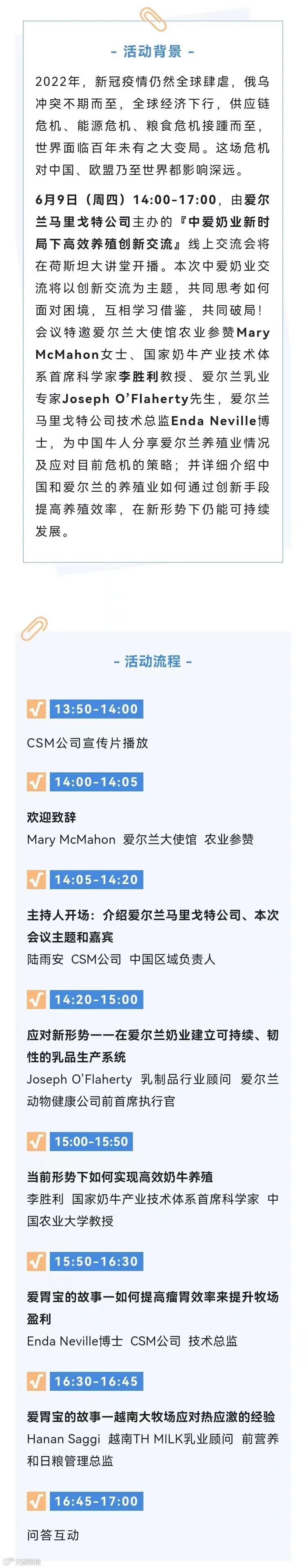 导读:6月9日(周四)14:00-17:00,由爱尔兰马里戈特公司主办的【中爱奶业新时局下高效养殖创新交流】线上交流会将在荷斯坦大讲堂开播。会议特邀爱尔兰大使馆农业参赞Mary McMahon女士、国家奶牛