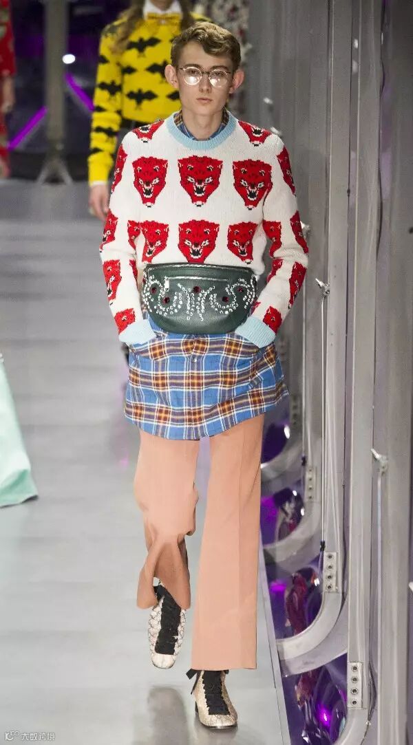 Walter Van Beirendonck的站立怪兽吐着红色舌头,Marcelo Burlon怒吼的猩猩双目流出红色眼泪,Dolce&Gabbana也以立体毛线绣装饰着咆哮的野兽。