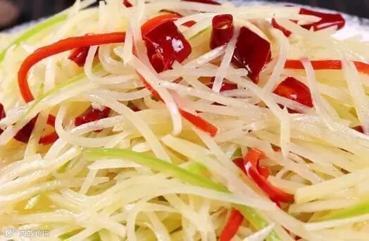 1。将土豆削皮,切细丝,泡在水中洗去淀粉,既能避免其变黑,又能使其在炒烧时保持白嫩、爽脆。炒前捞出,沥干水分。