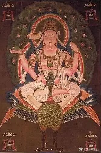 孔雀大明王,此尊相传为毗卢遮那佛或释迦牟尼佛的等流身。密号为佛母金刚、护世金刚。在密教修法中,以孔雀明王为本尊而修者,称为孔雀明王经法,又称孔雀经法。为密教四大法之一。孔雀明王的形像,一般都是白色,穿白缯轻衣。有头冠、璎珞、耳珰、臂钏等装饰,乘坐金色孔雀。现慈悲相,有四臂,分别持有吉祥果及孔雀尾等物。四种持物中,莲华表敬爱,俱缘果表调伏,吉祥果表增益,孔雀尾表息灾。