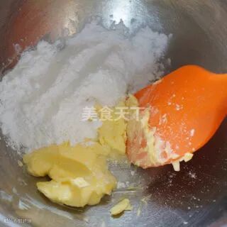 2、将黄油提前软化位到,接着微微打顺滑后加入糖粉、再用电动打蛋器打至变白蓬松。