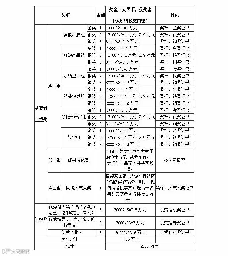 本届大赛将围绕江门的产业特点进行作品征集,同时征集概念和实物作品,参评作品类别分为:智能家居组、旅游产品组、水暖卫浴组、服装包具组、摩托车产品组、综合组等六大类。每组分别评出金奖1项、银奖2项、铜奖3项,本届大赛参赛者除了有机会获得三重奖励外,入围作品还将通过组委会推荐参与国内外相关展会。