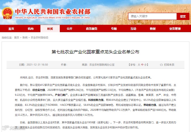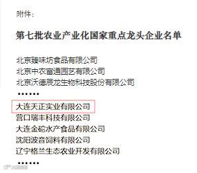 经农业农村部组织专家评审、全国农业产业化联席会议审议、公示,认定的第七批农业产业化国家重点龙头企业有412家,大连天正实业有限公司榜上有名。