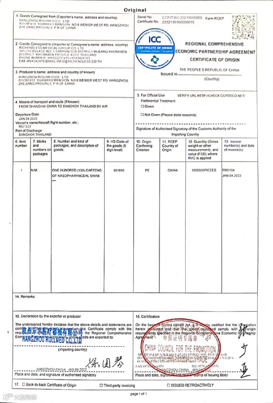 杭州乐宇医疗器械有限公司(主营医疗耗材和医疗器械)、浙江易众化工有限公司(主营化工产品)免费申办了RCEP项下输泰国和日本的原产地证书,杭州市贸促会予以审核并签发。