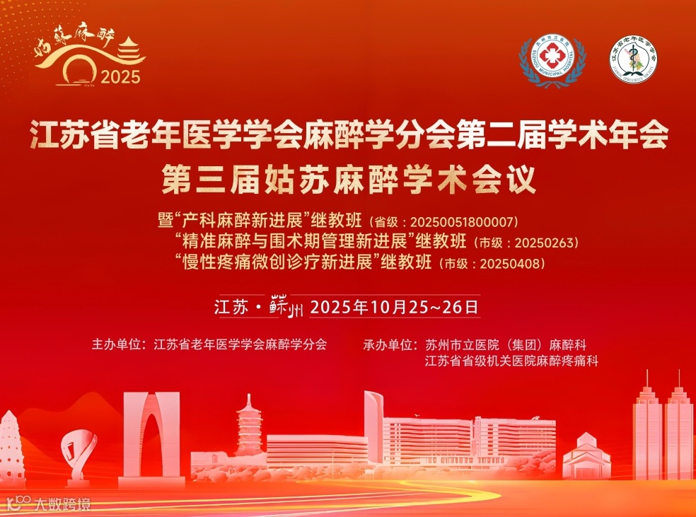 由江苏省老年医学会麻醉学分会主办,苏州市立医院承办的江苏省老年医学会麻醉学分会第二届学术年会暨第三届姑苏麻醉学术会议于2025年10月25日-26日在苏州举行