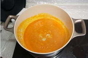 将南瓜泥加入小米粥中,搅匀