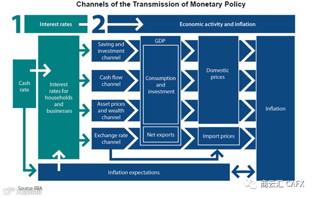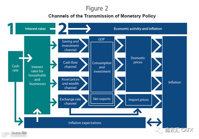 RBA的通胀目标平均在 2% 到 3% 之间。现金利率用于影响通货膨胀,以实现这一灵活的中期目标。货币政策的传导是指现金利率的变化如何影响市场利率、经济活动、就业和通货膨胀。