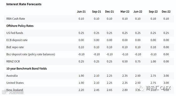 尽管就业强劲复苏,但通胀和工资增长仍然低迷。RBA目前预计通胀和工资增长会暂时增加。预计 2021 年通货膨胀率为 1.5%,到 2023 年中期为 2%。随着COVID-19 相关限制的放松,CPI 通胀预计将在截至 6月季度的一年中暂时上升至 3.5% 左右。