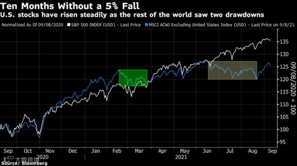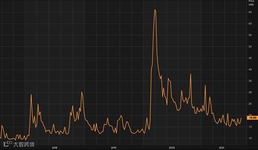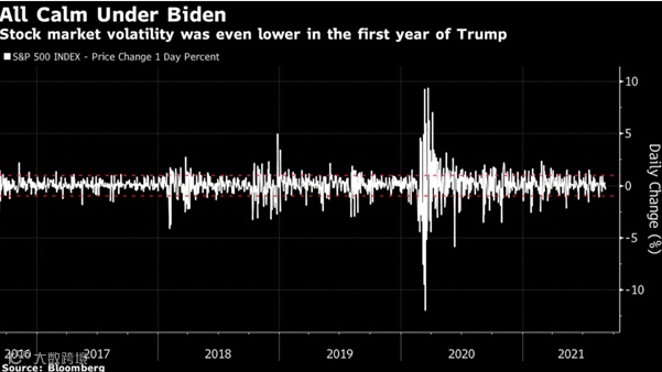美国股市的表现是令人惊讶的。对于疫情的恐慌,美国大选引发的混乱,美国总统拜登上台之后遇到的政治麻烦以及近期美军从阿富汗撤军的风波,丝毫没有影响到标普500指数一路向北不停歇的步伐。让我们通过下面一张图来对比一下美国前总统特朗普以及现总统拜登上台之后美国股市波动率。