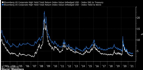 目前真正令人担忧的是信贷市场。当前的整体债券市场出人意料地稳定和安静。衡量美国公司发行的高收益债券表现的美国企业高收益指数跌至今年以来的最低水平,其与国债的利差正在收紧,基本回到了和金融危机年份2008年前一年的2007年的水平(看下图)。