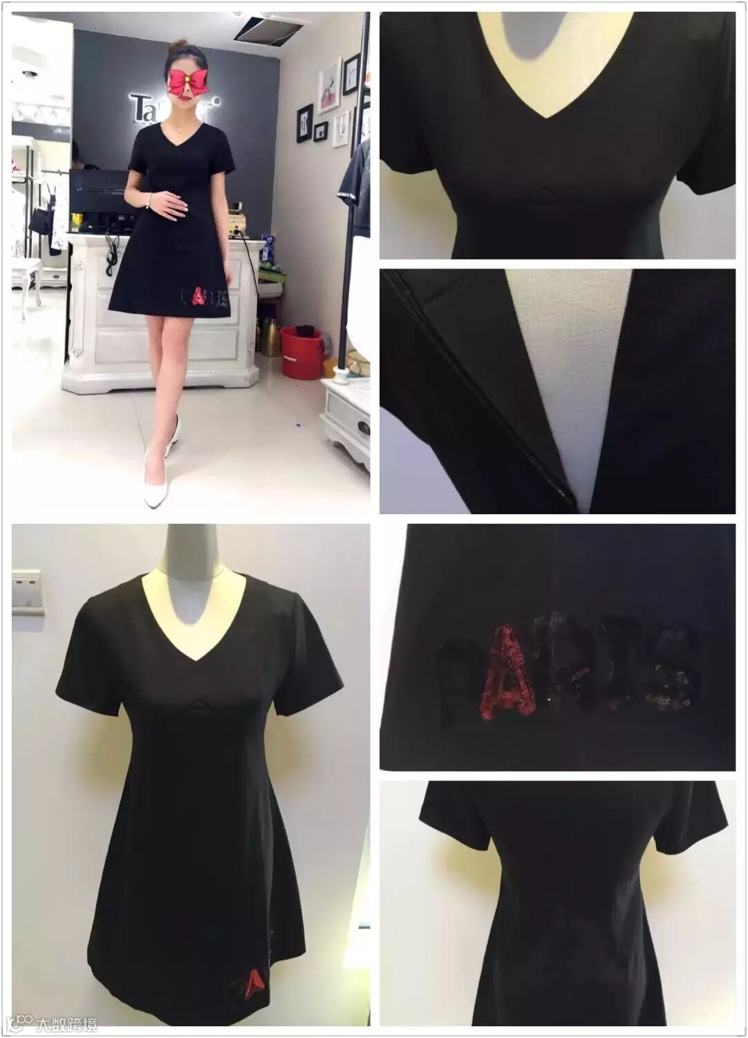图1:强烈推荐的一款小黑裙!简洁、大方、时尚!黑色给人端庄,优雅又神秘的感觉,任何场合绝对不失大雅,v领设计,腰部收腰显得干练又女人味十足 而裙摆处的亮片字母又恰到好处的起到了点睛的作用,让整个裙子活力四射!裙子版型超赞,面料硬体有内衬!重点还要说做工,大家可以看细节图哦~包边做工非常完美的说,不是小厂家可以做到滴。所以,你必须值得拥有的一款,不要犹豫,不要错过哦!189元/件