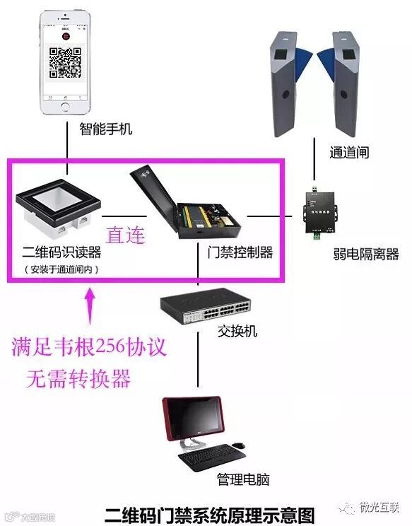 满足韦根了256协议,微光互联二维码扫描器与门禁控制器直连,无需RS232转韦根转换器。