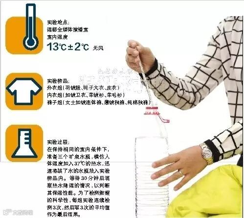 将37℃温水分别放入呢料、羽绒、真皮等材料的衣服进行保暖测试
