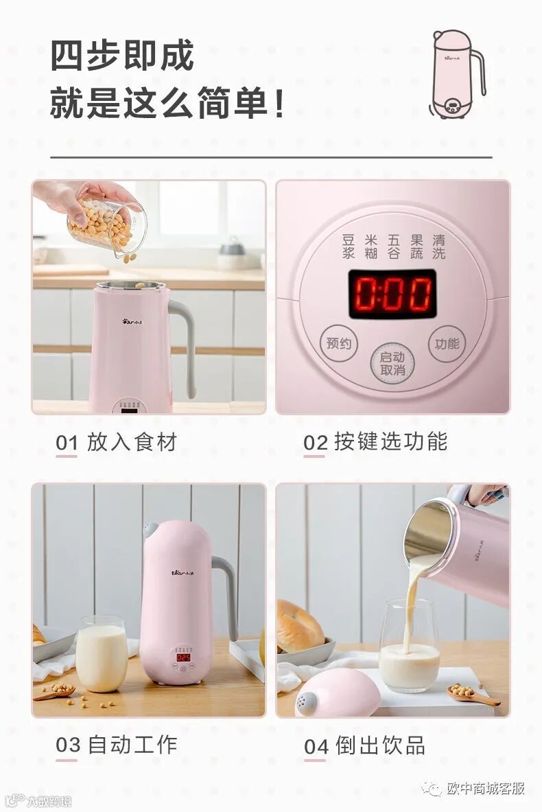 豆浆机采用时尚设计,有多档选择,能做五谷、五谷、米糊等多种饮品,适合多种口感的需求,忙碌的上班族来不及泡豆,也可以在早晨梳洗打扮的空挡,将豆子稍加清洗,即可安心等待香浓熟豆浆来喝了