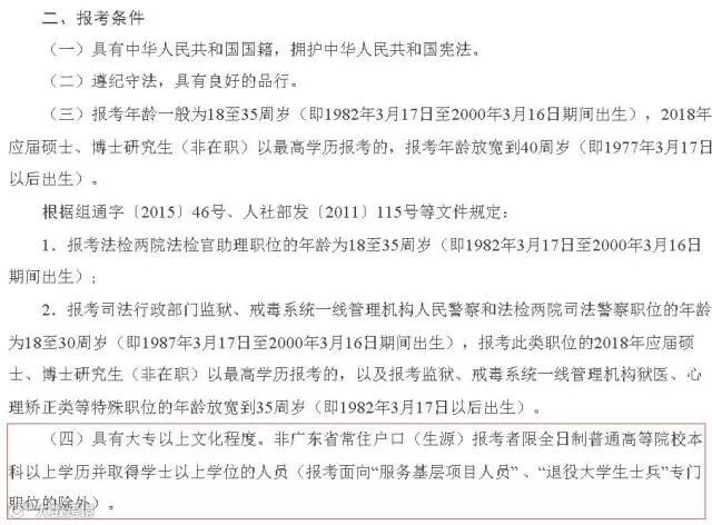 非广东省常住户口(生源)报考者限全日制普通高等院校本科以上学历并取得学士以上学位的人员(报考面向“服务基层项目人员” 、“退役大学生士兵”专门职位的除外)。