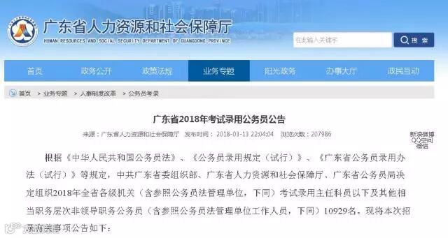 近日,广东省人力资源和社会保障厅发布关于《广东省2018年考试录用公务员公告》