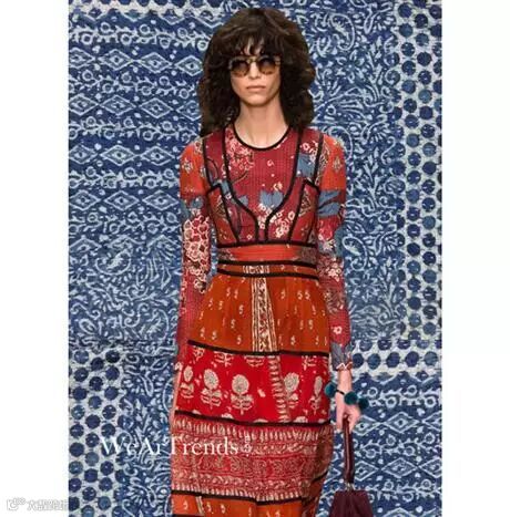 同时,拼凑图案技术遍布世界各地,如蜡染印花技术和木板印刷技术,这创造了一个波西米亚的世界。Burberry Prorsum则更进一步地用镜像叠加当做装饰印花。