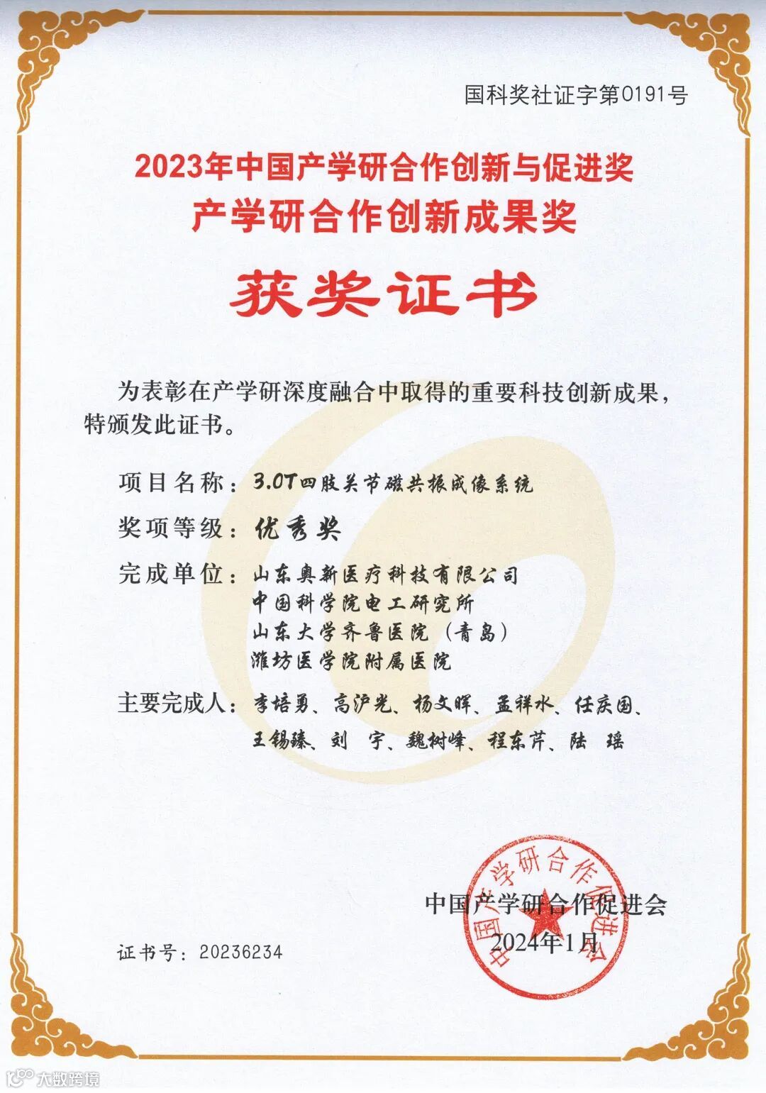 2024年3月17日,中国产学研合作促进会在京成功举行第十五届中国产学研合作创新大会。继2021年获评中国产学研合作创新示范企业后,奥新医疗产学研合作成果再获肯定。奥新医疗与中科院电工研究所合作开发、在山东大学齐鲁医院(青岛)和潍坊医学院附属医院进行临床试验的《3.0T四肢关节磁共振成像系统项目》,荣获“2023年中国产学研合作创新与促进奖产学研合作创新成果奖”。