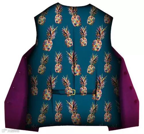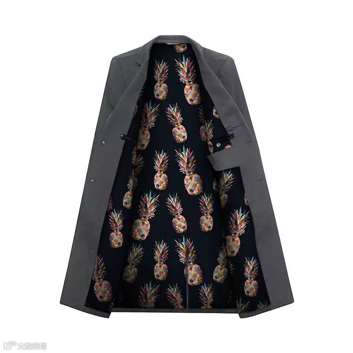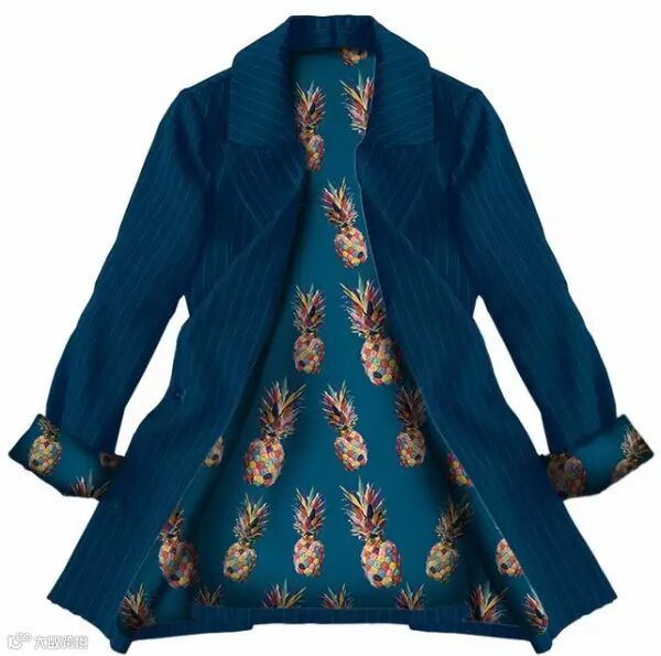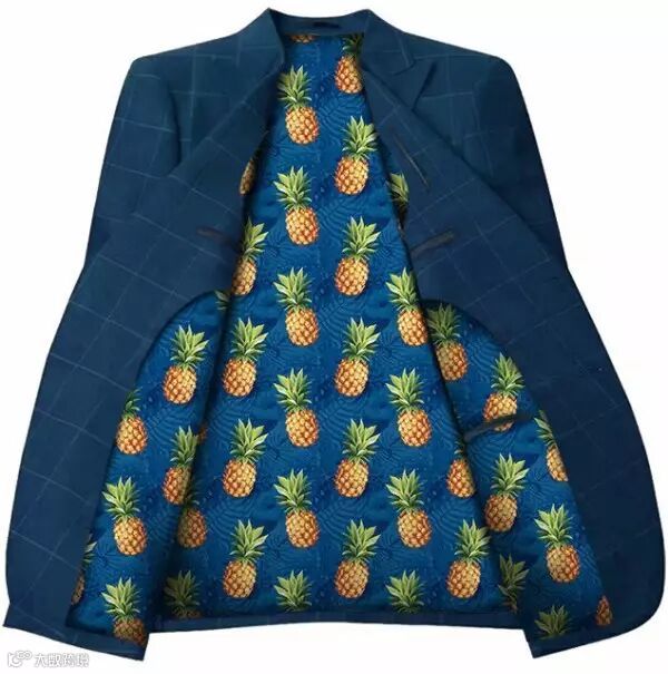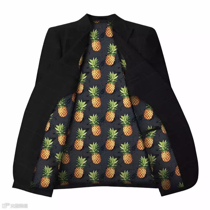 生活中常见的水果通过不同的排列组合,或四方连续,或满版无规则的排放顺序,总能产生不同的视觉新意。高度饱和感水果印花图案运用趣味流行艺术工艺,营造出酷夏清凉香甜的时尚味道。而今天把鲜活的水果放在西服里料中,突破以往简单的里料设计,使西服看上去个性活泼又不失优雅。