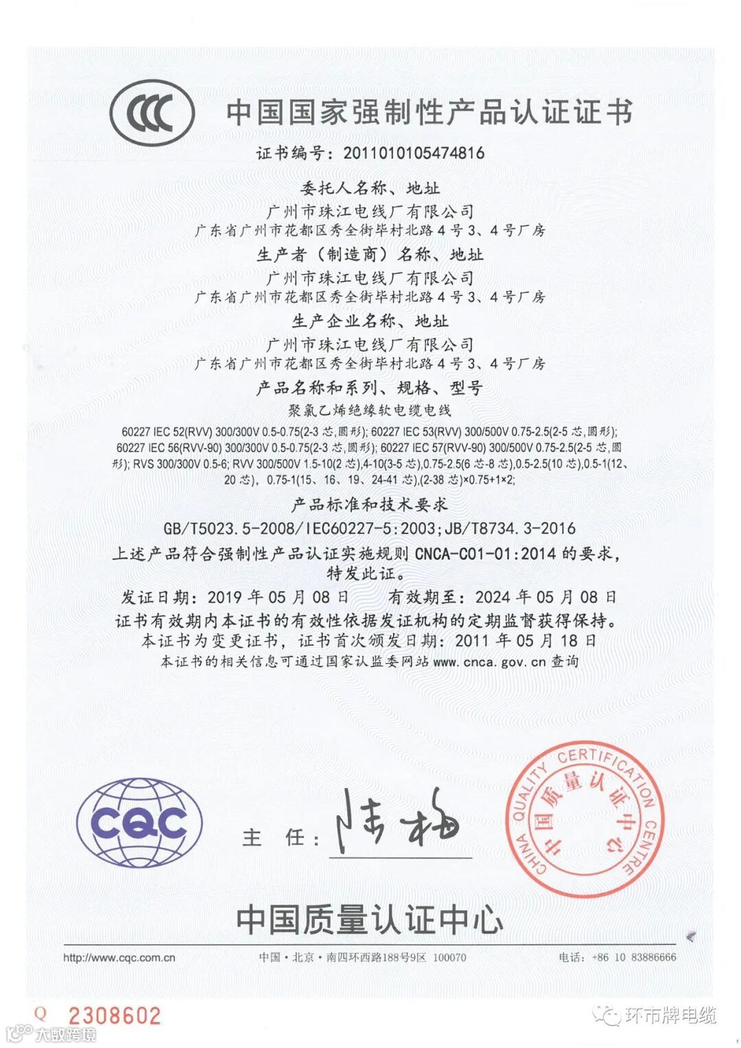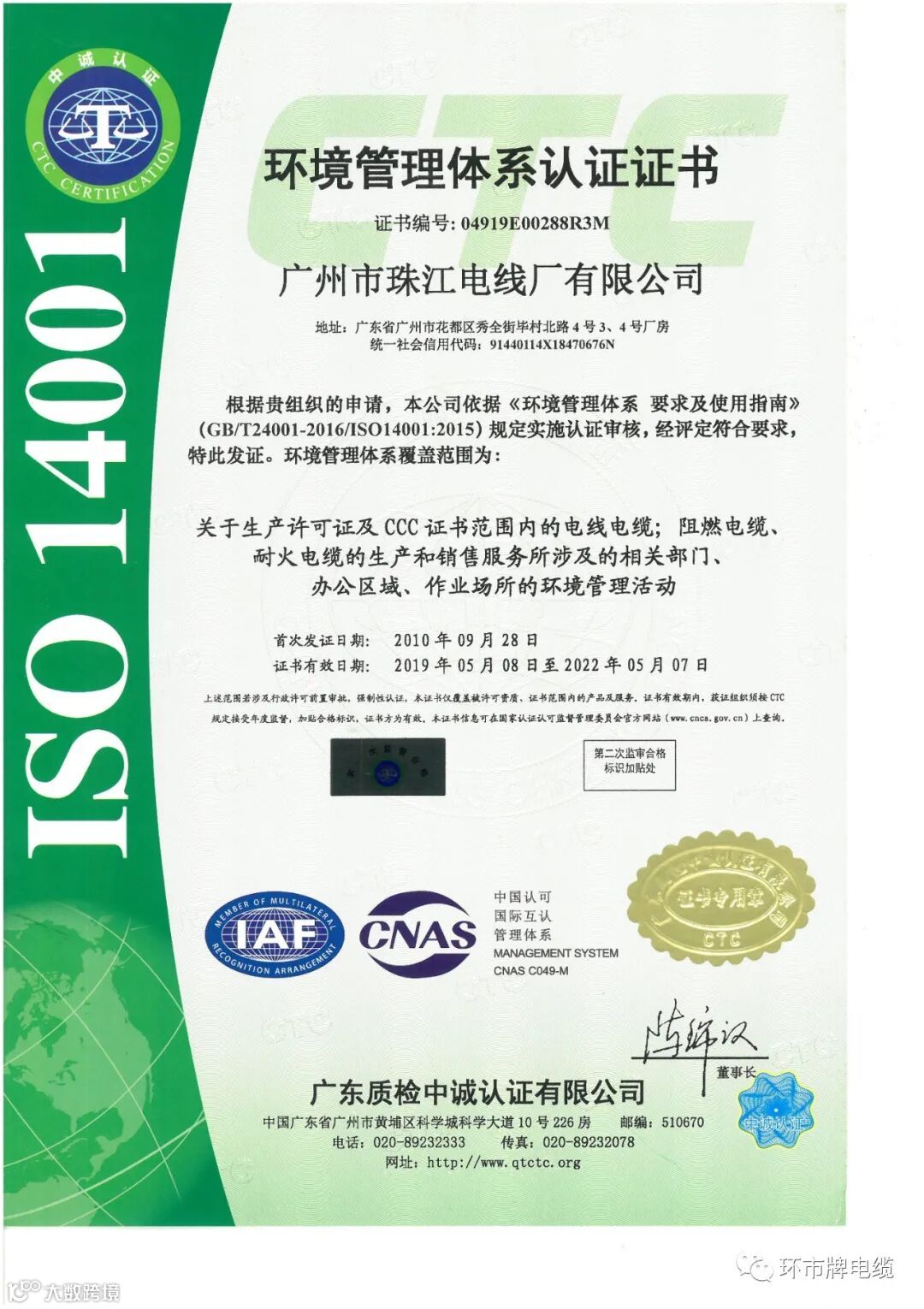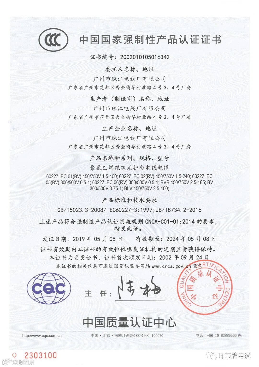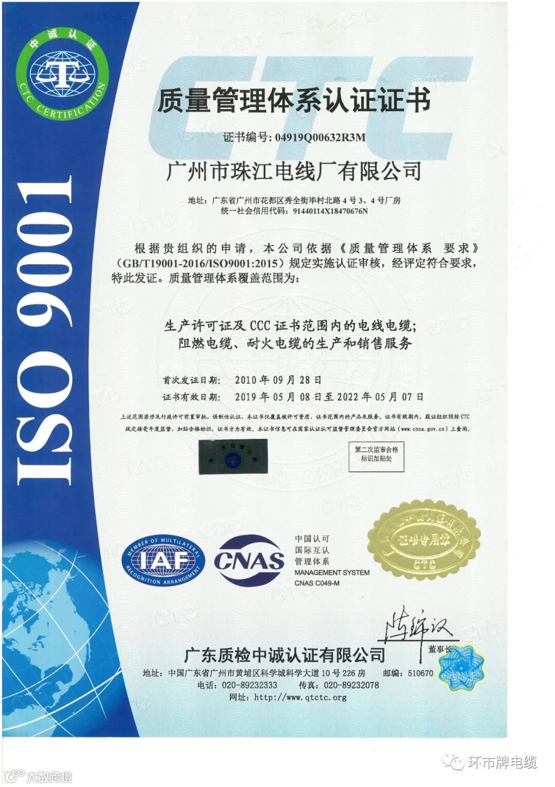 广州市珠江电线厂有限公司始终把“质量是企业的第一生命”作为企业的生存原则,三十年如一日,坚持秉承“为客户提供优质产品”的崇高理念,严格按照国家和国际标准进行标准化生产;并通过质量、环境、健康安全体系认证、国家CCC强制性产品认证,并拥有环保电缆工程研发中心和研究开发机构。