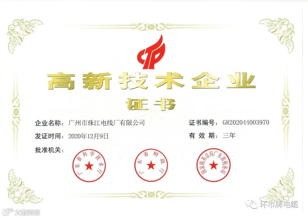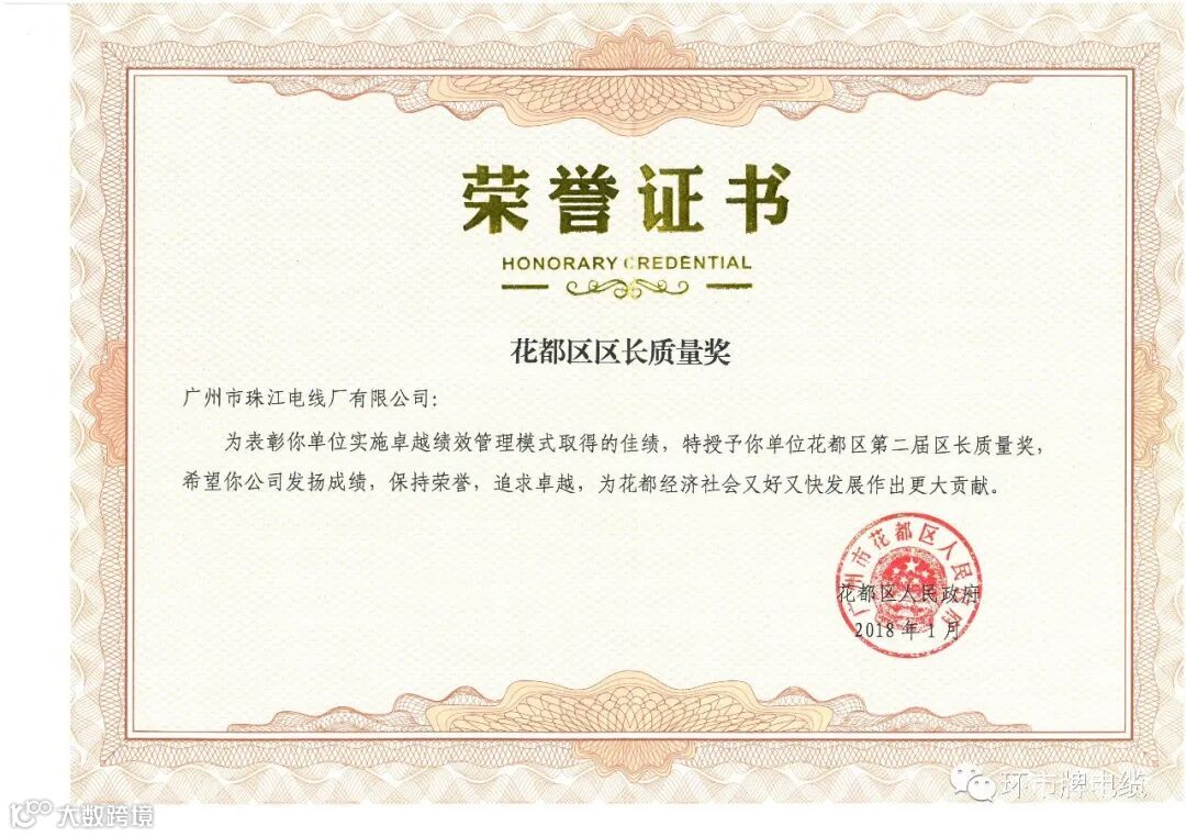 广州市珠江电线厂有限公司自成立以来先后荣获:国家高新技术企业、花都区区长质量奖、广东省名牌产品、广东省著名商标、广东省“守合同重信用”企业、广州市清洁生产企业、中国电线电缆十大影响力品牌等等荣誉。