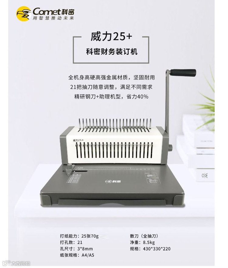 科密装订机系列涵盖:胶圈装订机、铆管装订机、线装机、热熔封套胶装机