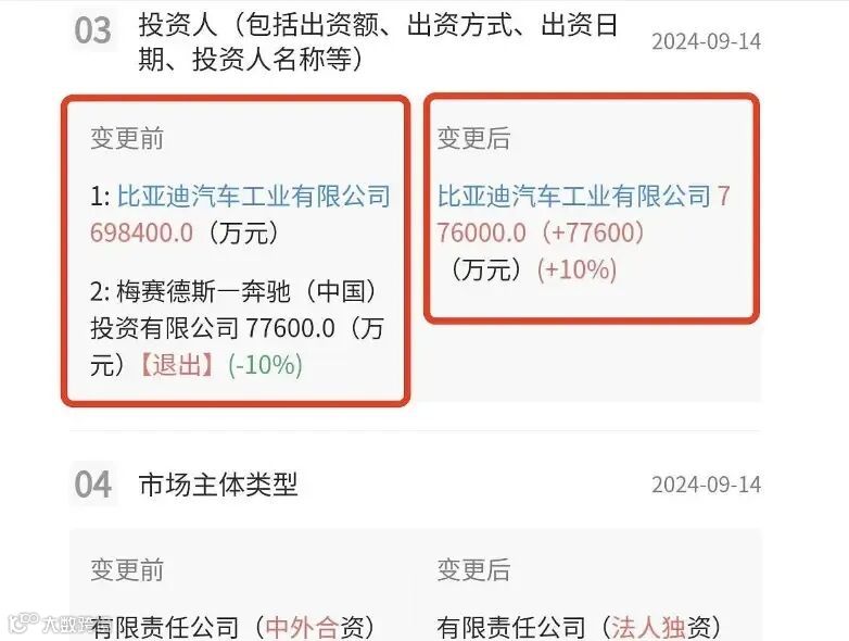 据天眼查信息显示,9月14日,深圳腾势新能源汽车有限公司发生股权变更,比亚迪汽车工业有限公司将腾势剩余的10%梅赛德斯-奔驰(中国)投资有限公司股份回购,当前深圳腾势新能源汽车有限公司由比亚迪汽车工业有限公司全资持股。此外,该公司董事Hans Georg Eegel退出;该公司由“外资公司”变更为“公司”。这也意味着腾势汽车,成了比亚迪集团控股的全资子公司。